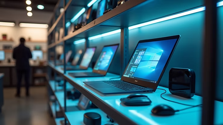 Display shelf showcasing laptops and computer accessories
